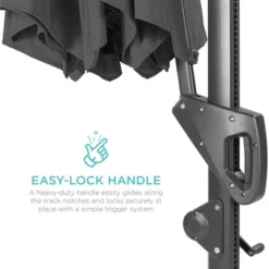 - FREE-MOTION TRACK: The lock-and-release handle slides up and down a free-motion track to adjust the canopy’s tilt and provide up to 100 angles of shaded comfort!