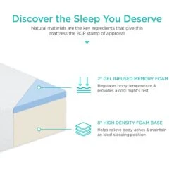 DOUBLE-LAYERED MEMORY FOAM: A 2.5-inch, gel-infused memory foam layer rests over a high-density foam base, distributing body heat for a cool and comfortable sleep