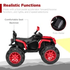 LARGE, TREADED WHEELS: With 4-wheel suspension, it can conquer grass, dirt, driveways, and sidewalks, while LED headlights and a horn create a fun and realistic ATV experience!