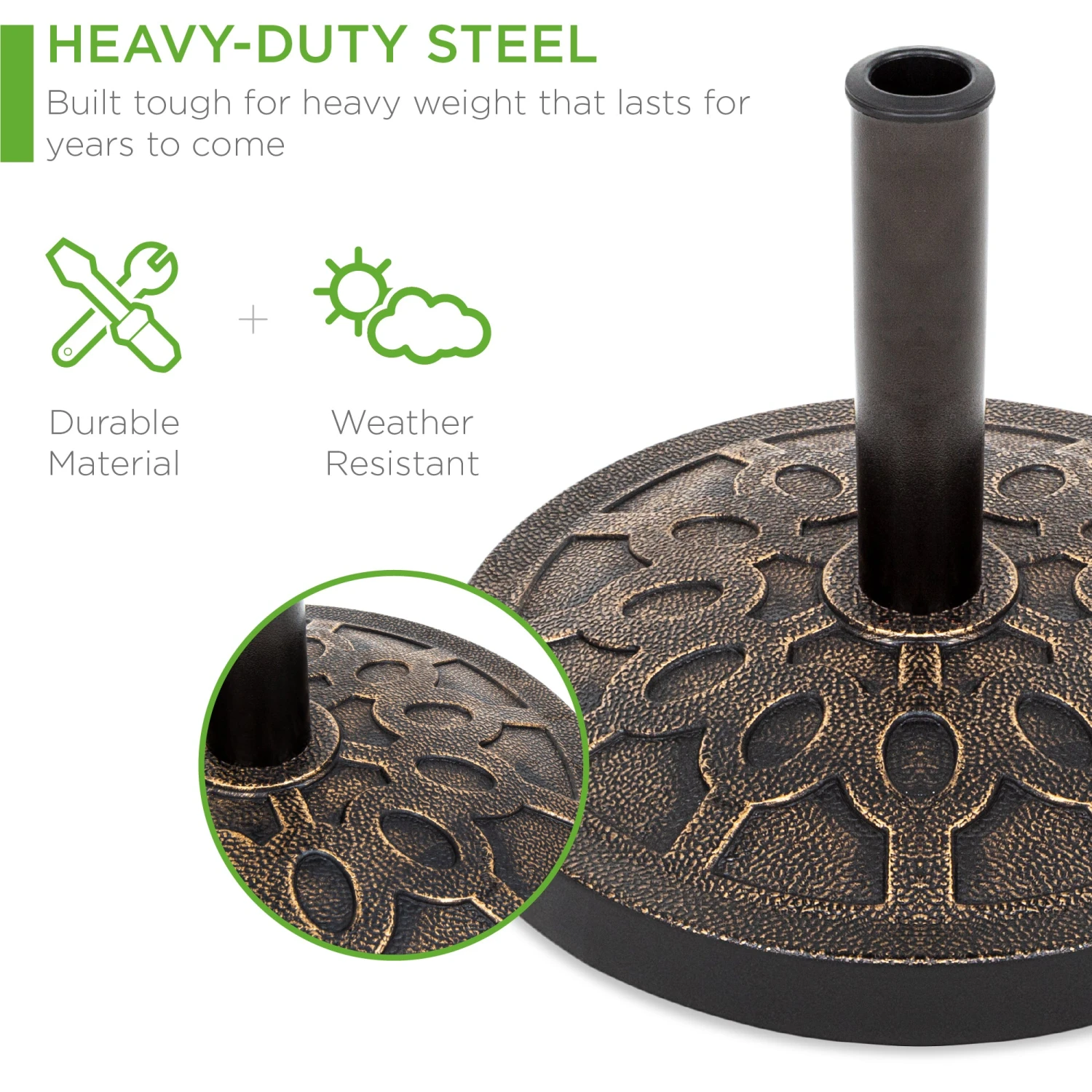 DURABLE MATERIAL: This heavy-duty base is made of durable resin and steel that weighs 29 pounds to help prevent tilting