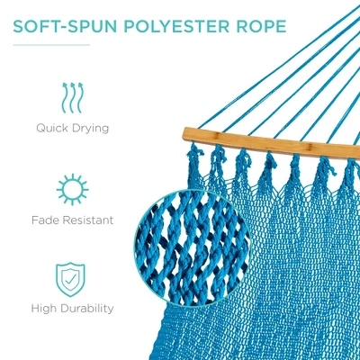 How do you like to relax? For some, when they hear relaxation” a hammock immediately comes to mind. This Caribbean Style Hammock features high durability, quick-drying, and fade-resistant fabric. The mesh layout imparts a high strength bed, while the weather-sealed, anti-warping spreader bar cradles the body. A gentle curve in the spreader bar prevents flipping while cradling the user. The spreader bar folds in half to fit in the convenient carrying bag with three easy steps: 1 Press the Button, 2 Separate and Fold, 3 Roll it Up. This outdoor classic lets you turn two trees into your private comfort zone. Or use a compatible accessory as this hammock pairs with durable stands for relaxation anytime! (Note: Hammock Stand Not Included)”