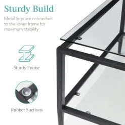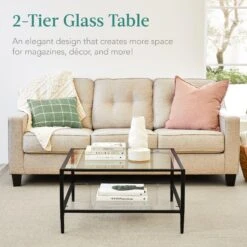 ELEGANT 2-TIER GLASS DESIGN: This table’s glass top and bottom shelves make it a modest yet elegant living room addition or a decorative centerpiece on which to place magazines, snacks, or beverages