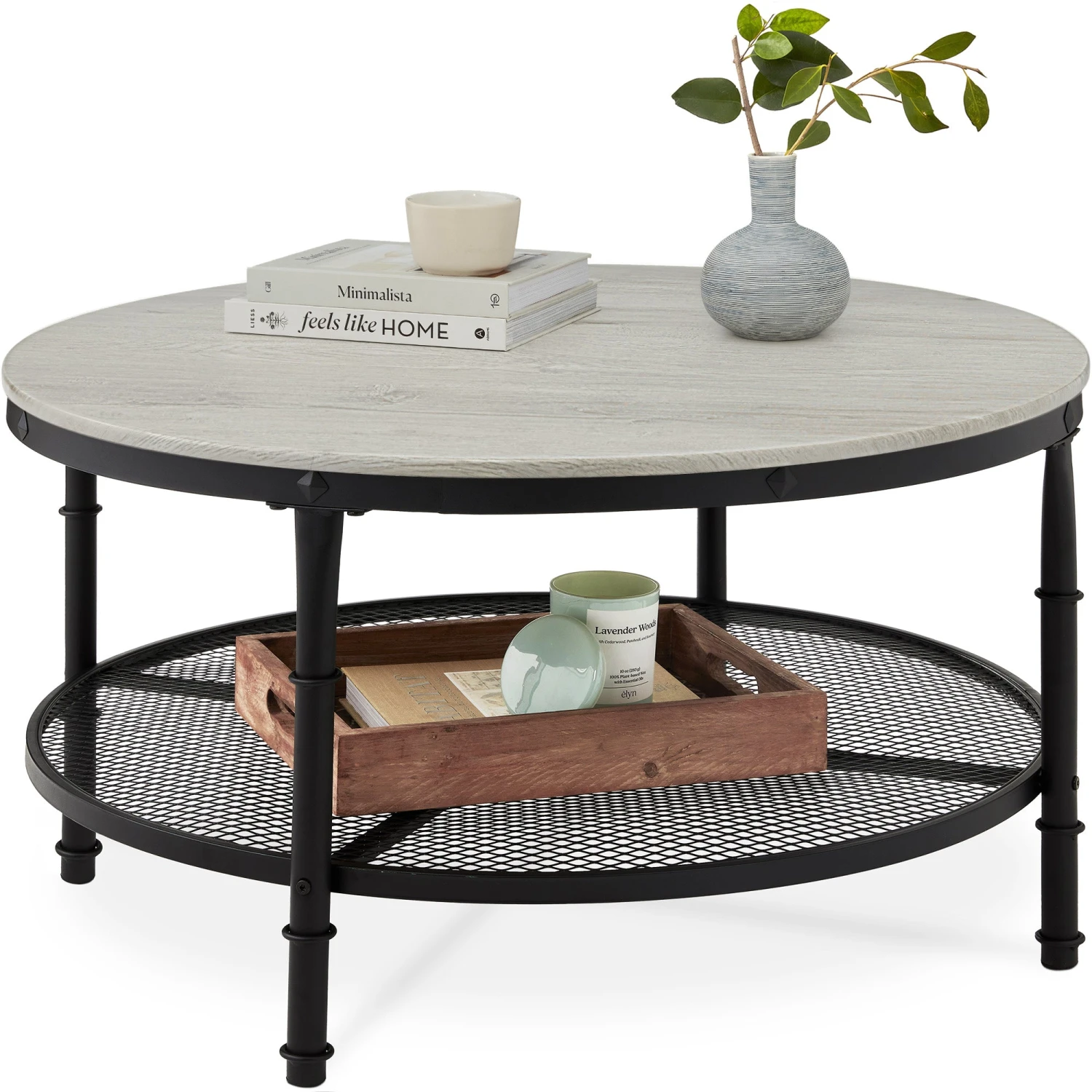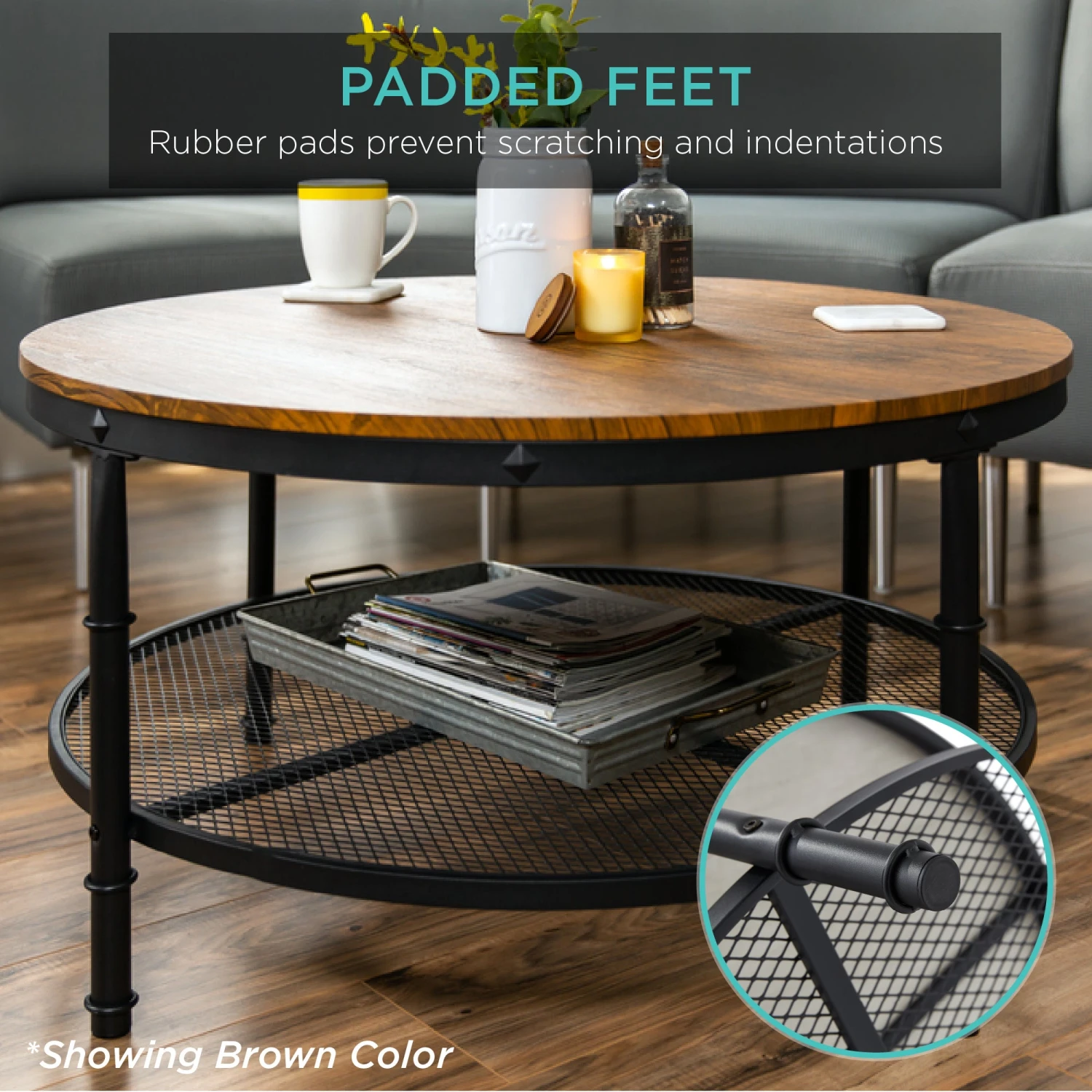 Best Choice Products 2-Tier Round Industrial Wood & Steel Coffee Table, Storage Shelves – 35.5in