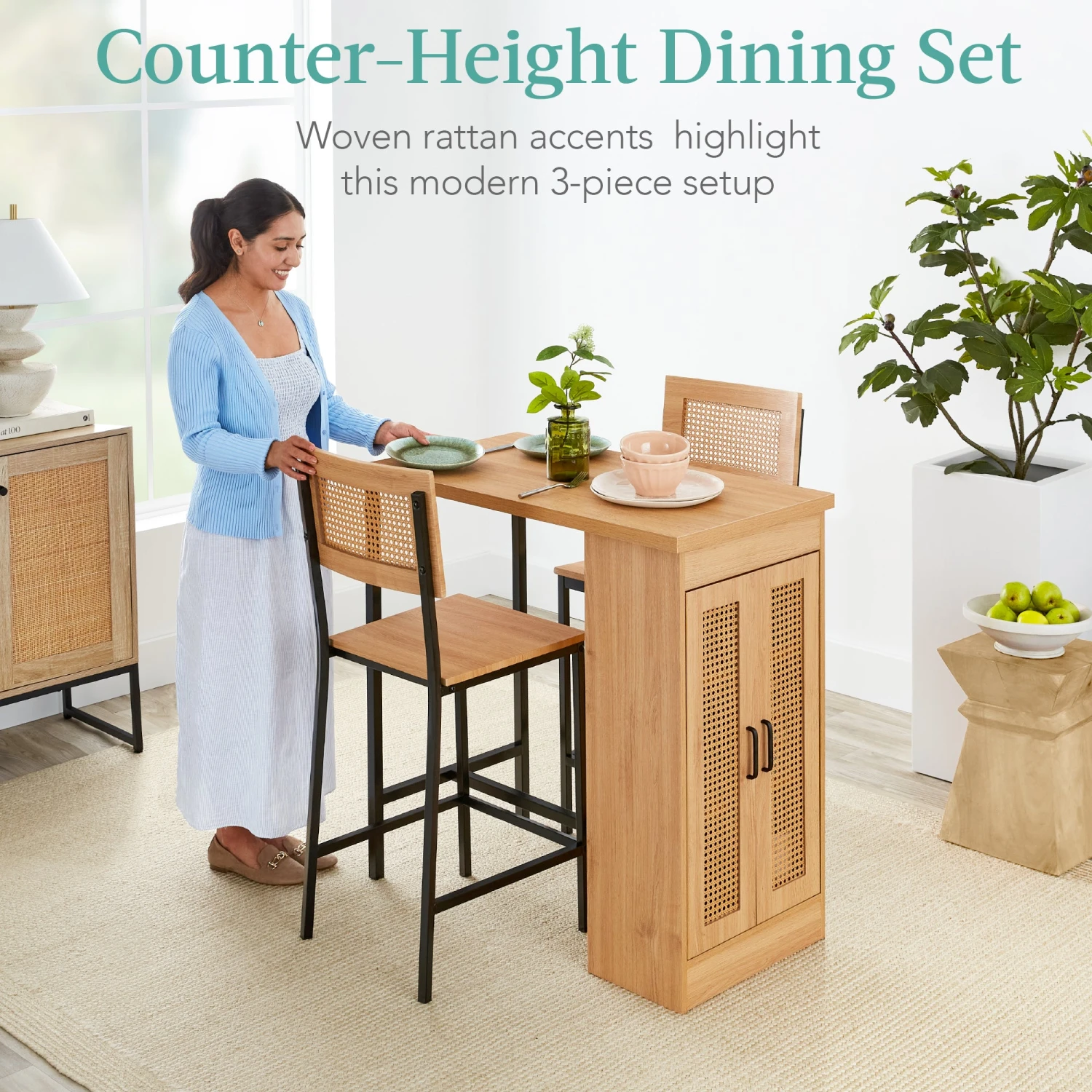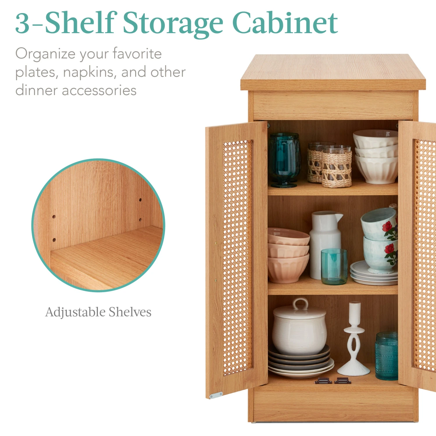 3-SHELF STORAGE CABINET: Adjustable shelves help you store your favorite dinnerware, napkins, and cutlery while two woven rattan cabinet doors provide extra protection