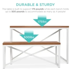 - DURABLE & STURDY: High-quality metal and wood laminate can easily support a party of four; each seat can hold up to 500 pounds, while the table boasts a high 175-pound capacity; TABLE DIMENSIONS: 45.5″(L) x 29.5″(W) x 29.5″(H); BENCH DIMENSIONS: 40.5″(L) x 12″(W) x 17.5″(H); TABLE WEIGHT CAPACITY: 175 lbs.; BENCH WEIGHT CAPACITY: 500 lbs.