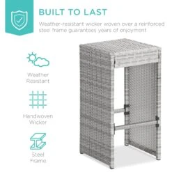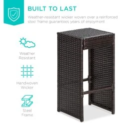 BUILT TO LAST: Weather-resistant wicker is tightly woven over a reinforced steel frame to support weights up to 450lbs (table) and 350lbs (per stool)