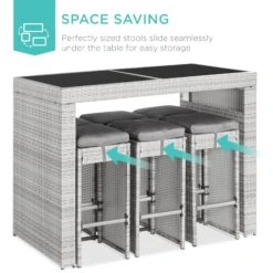SPACE-SAVING DESIGN: Slide the six stools under the table when not in use to keep your outdoor space organized and ready for entertainment