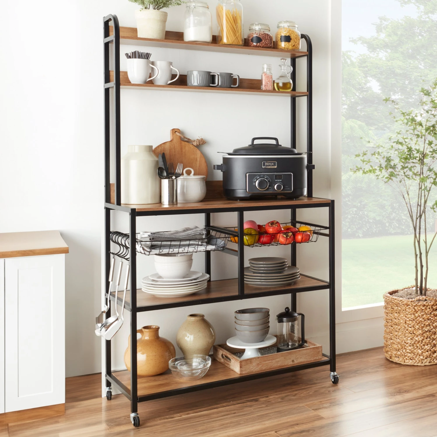 ADJUSTABLE FEET & LOCKING WHEELS: Versatile baker’s rack provides the option to screw in adjustable feet that help ensure balance or four caster wheels (two locking) for easy mobility