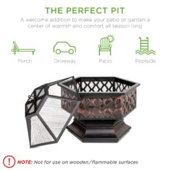 RUSTIC DECORATION: Hexagonal steel fire pit sports a distressed bronze finish and combines a tight steel mesh with decorative lattice for a unique addition to your outdoor decor