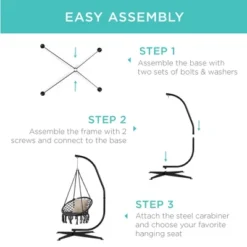 - Easy AssemblyStep 1: Assemble the base with two sets of bolts and washersStep 2: Assemble the frame with 2 screws and connect to the baseStep 3: Attach the steel carabiner and choose your favorite hanging seat
