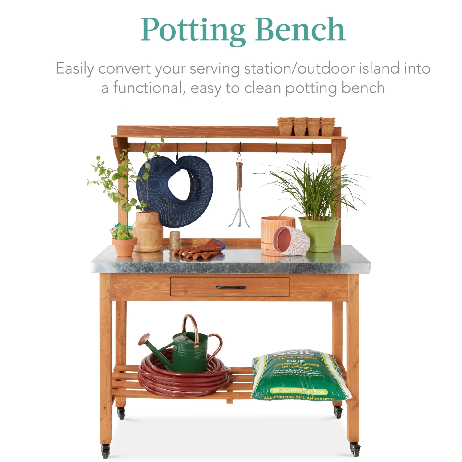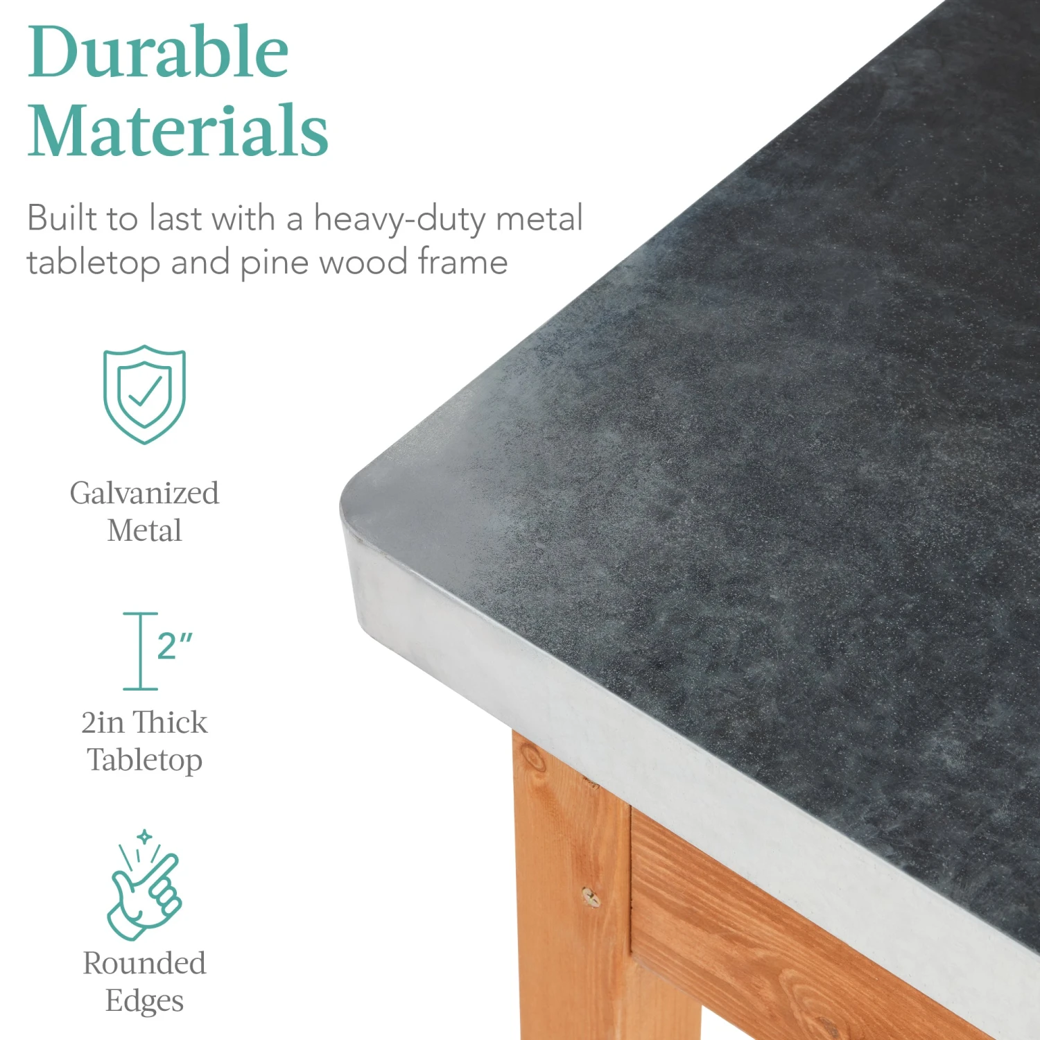 DURABLE MATERIALS: Thick and easy to clean, the galvanized steel tabletop rests on a beautiful pine wood frame to make this multipurpose bench great for indoor and outdoor use