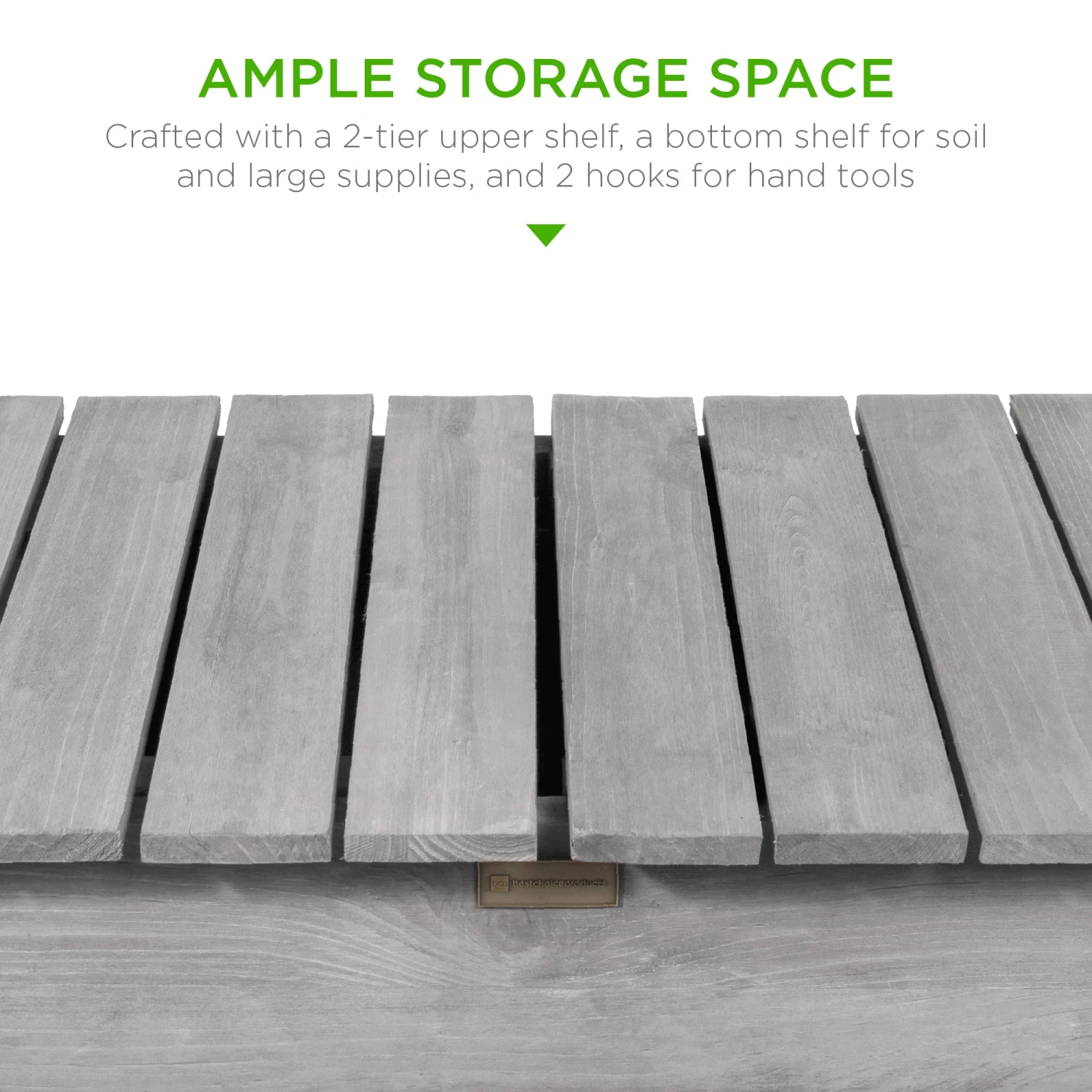 AMPLE STORAGE SPACE: Keep all your gardening supplies close at hand with a 2-tier upper shelf, a bottom shelf for soil and other large supplies, and two hooks for your go-to hand tools!